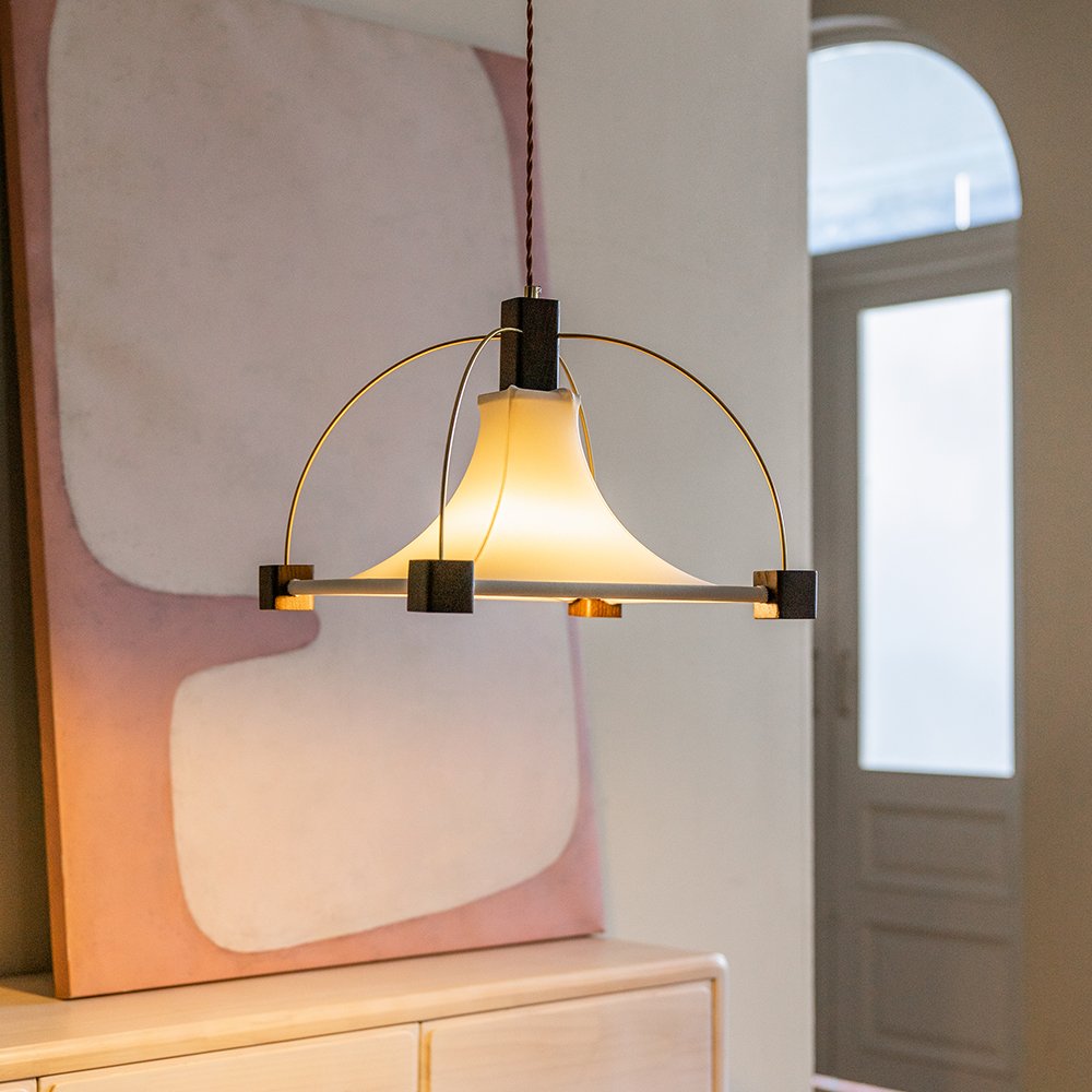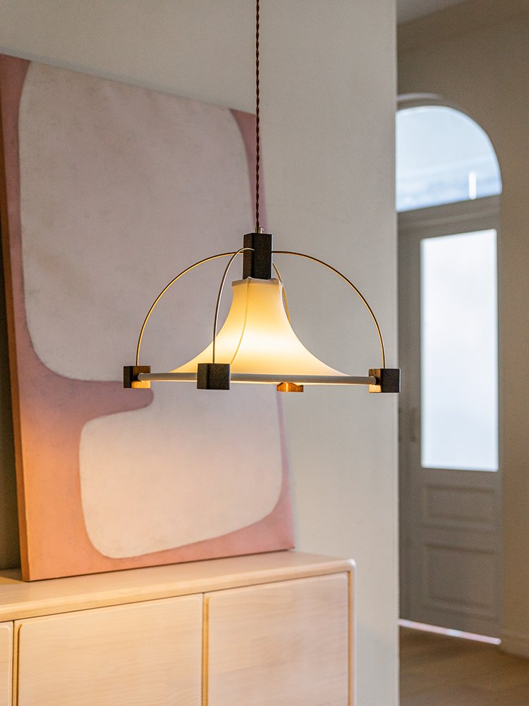 This pendant light is a masterpiece of modern design. Combining a soft – hued shade with geometric metal and dark accents, it casts a unique charm, enhancing any space’s aesthetic.