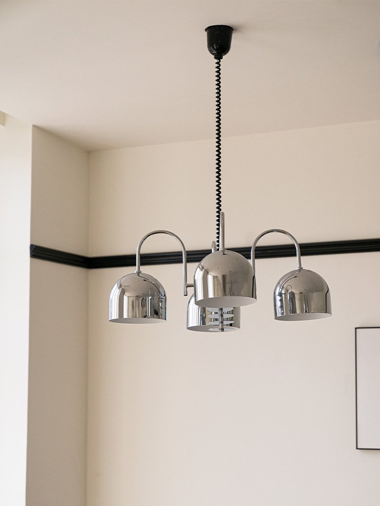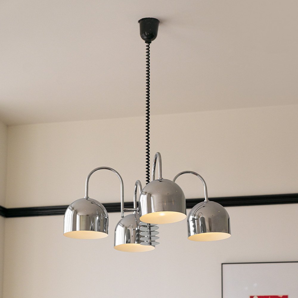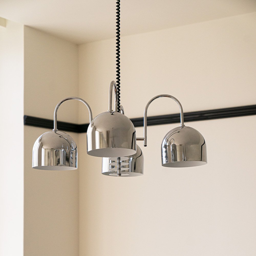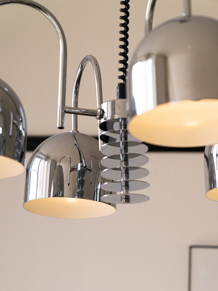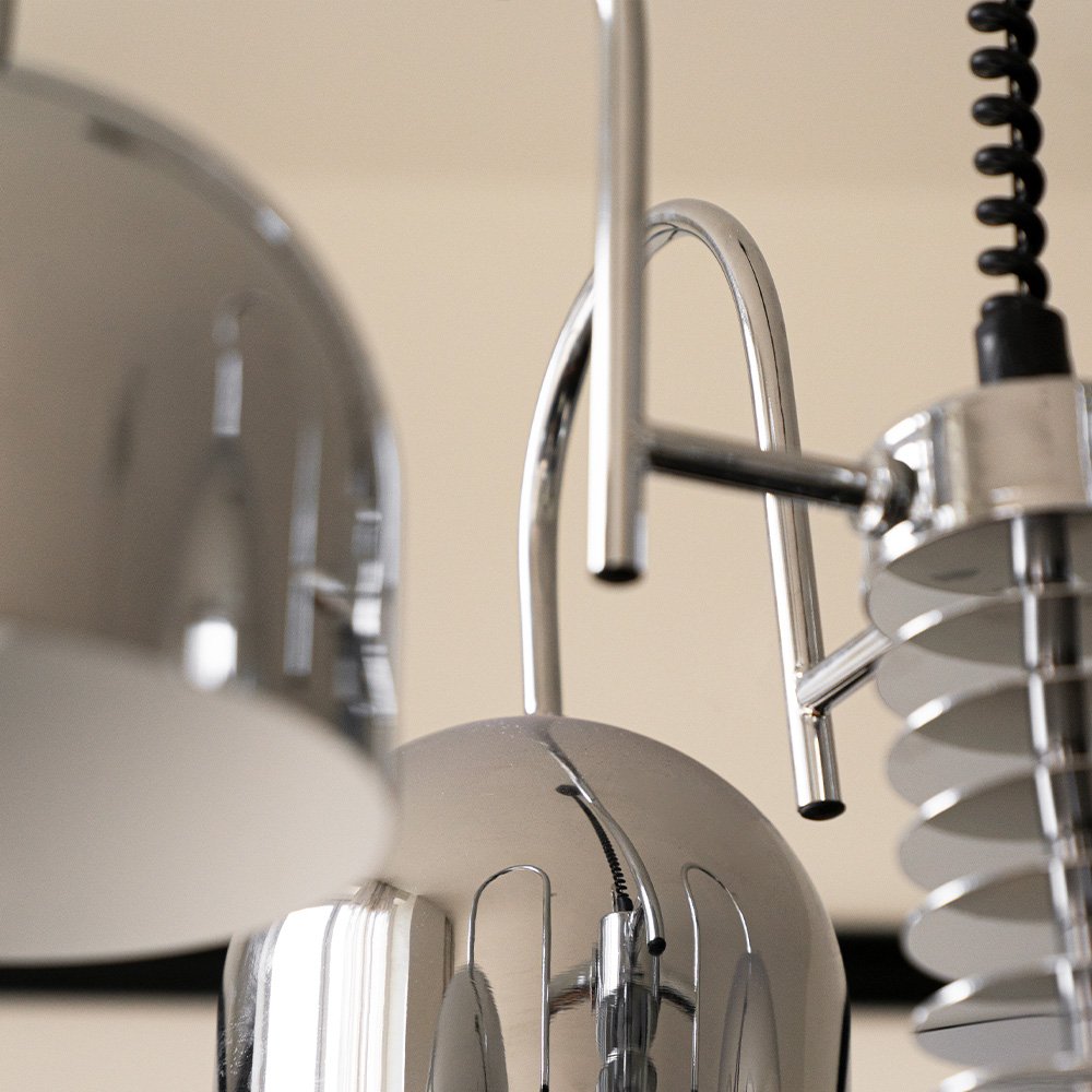 Patinated iron chains suspend inverted chalice-like shades, their hammered surfaces capturing molten lightplay. Etched rims refract industrial chiaroscuro, as riveted seams articulate liquid metallurgy. This chandelier crystallizes alchemical paradox – where brutalist gravity dances with Baroque fluidity in monochromatic ferrous poetry.